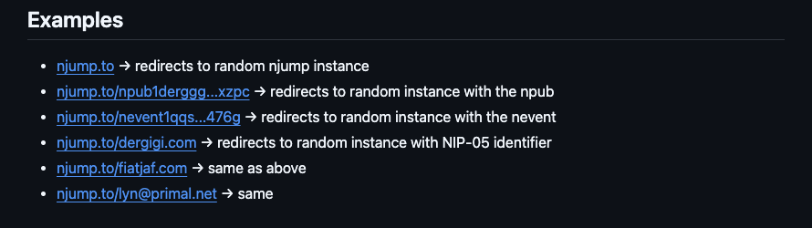 njump.to is a fast redirect service that provides a single URL to automatically forward users to a random njump mirror instance. The service randomly selects from multiple njump mirrors (njump.me, nostr.at, nostr.eu, nostr.ae, nostr.com), preserving all paths and query parameters. This eliminates the need to remember or choose between multiple instances, making it easier to access Nostr profiles, events, and other entities through a single memorable URL.